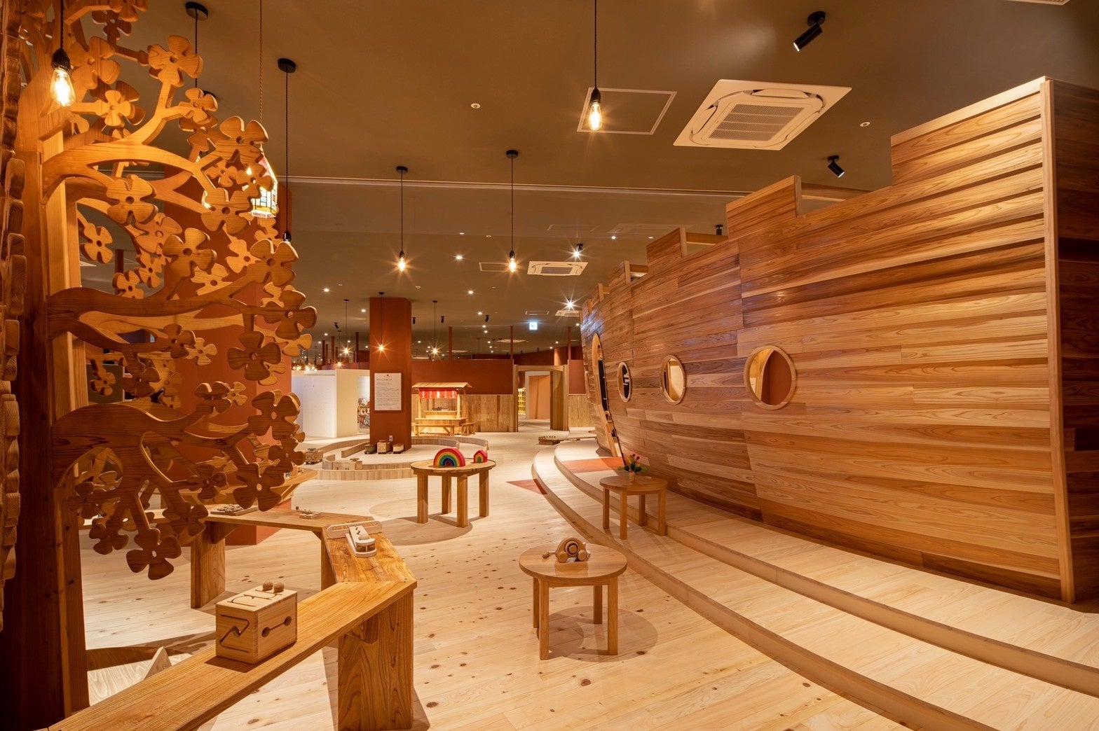 福岡おもちゃ美術館は、認定特定非営利活動法人芸術と遊び創造協会(新宿区、理事長・多田千尋)が、2022年4月にららぽーと福岡に開館した、九州初のおもちゃ美術館です。直営館としては、東京おもちゃ美術館(2008年4月オープン)に引き続き、2館目となります。1300㎡超の館内には福岡県産材のヒノキ、スギ、センダンをふんだんに使用しており、五感で木のぬくもりを感じながらあそぶことができる体験型木育施設です。