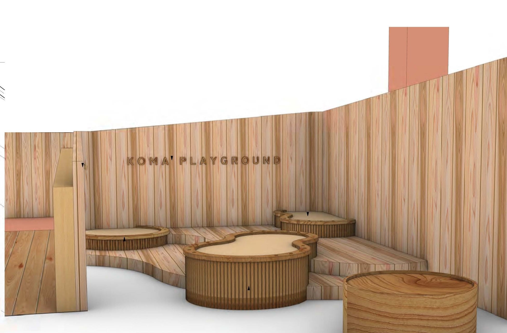 こまひろばではリニューアル前の「こま庭園」がパワーアップし、その場に居合わせた複数の家族でいっしょに遊べるひろいコマ台が登場します。