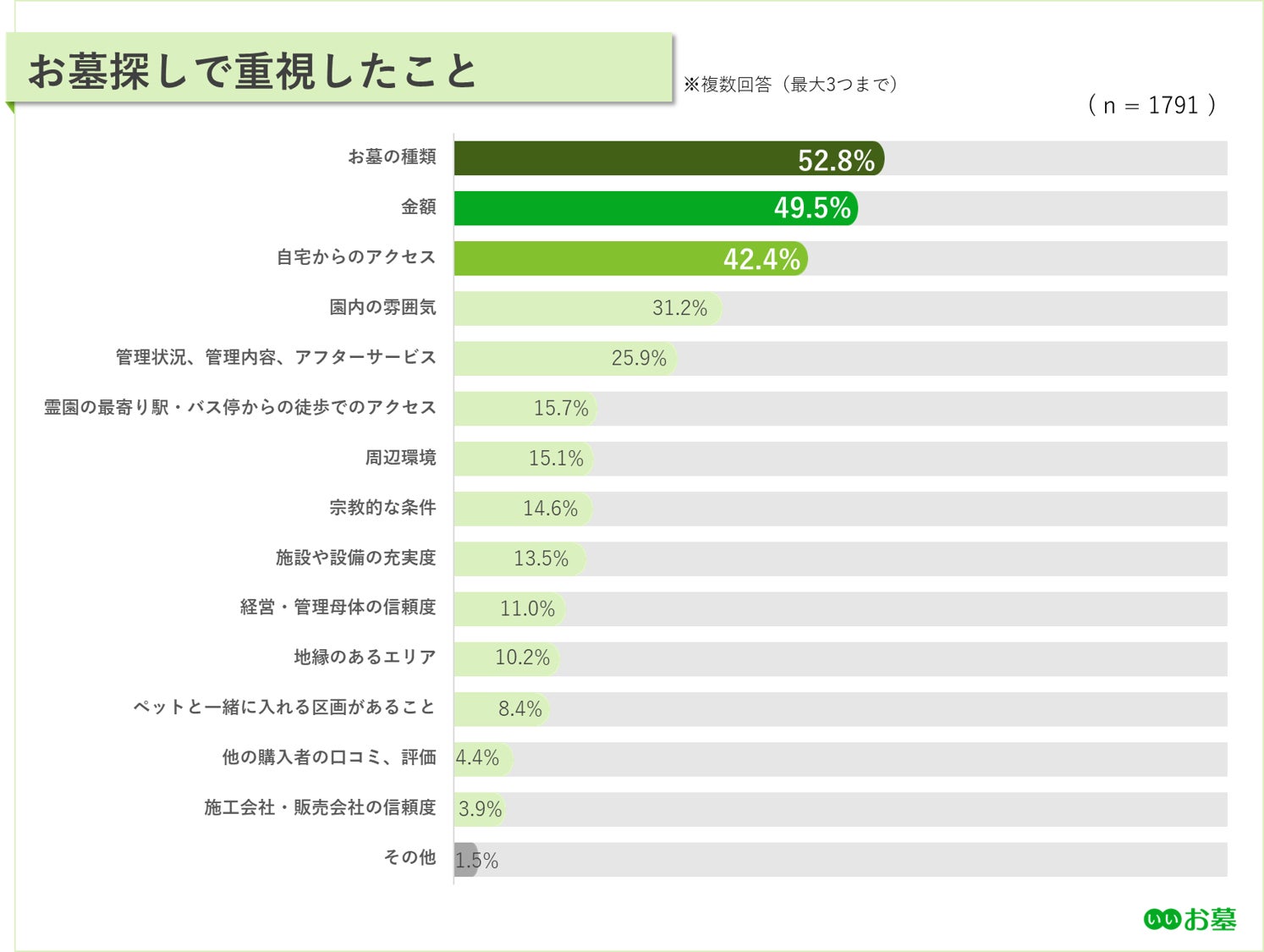 お墓選びで重視したことは「お墓の種類」が最多、「金額」「自宅からのアクセス」も重視