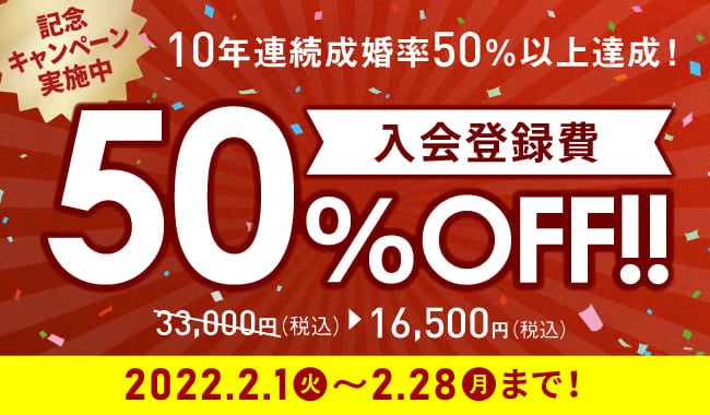 このたび、成婚率50%を継続して達成したことを記念し、新規入会者へ向けたお得なキャンペーンを実施いたします。