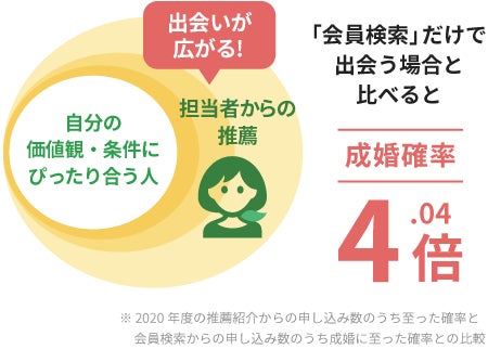 必要に応じて、婚活のプロならではの視点であなたの価値観とは違う、でもあなたに合うお相手の紹介を受けられることで、出会いの幅が広がります。