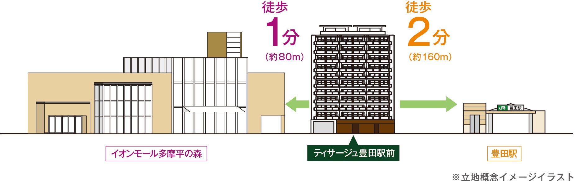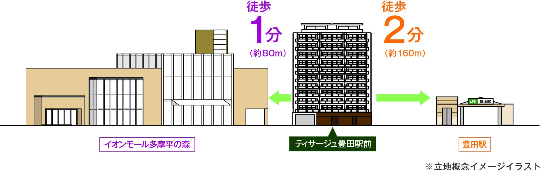 本物件はJR中央本線「豊田」駅徒歩2分の立地に誕生するファミリー向けレジデンスです。都心へ直結のアクセスで、新宿駅や東京駅への通勤・通学も便利であり、また、約110店舗を有する大型商業施設「イオンモール多摩平の森」が近接徒歩1分と利便性抜群の地に位置しています。日常のお買い物はもちろん、ファッション、雑貨、インテリア、レストラン、子供向け広場など幅広い世代が楽しめるスポットが集積しており、日々の暮らしに華やぎと彩りを与えます。また、湧き水で有名な黒川清流公園などの緑の潤いも身近に感じられ、自然と利便性が調和した豊かな生活環境を享受できます。