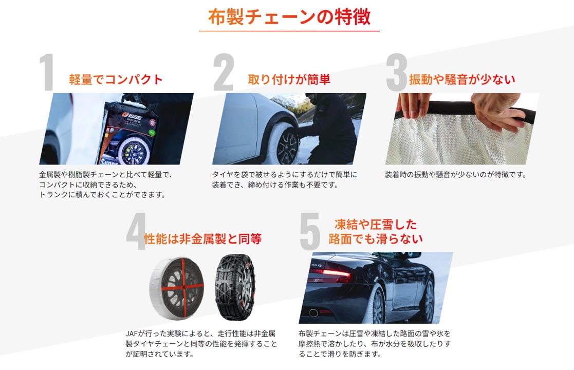 特に2018年のチェーン規制以降、いざというときのための備えとして、手軽に持ち運べて装着が簡単な布製チェーンが注目されています。