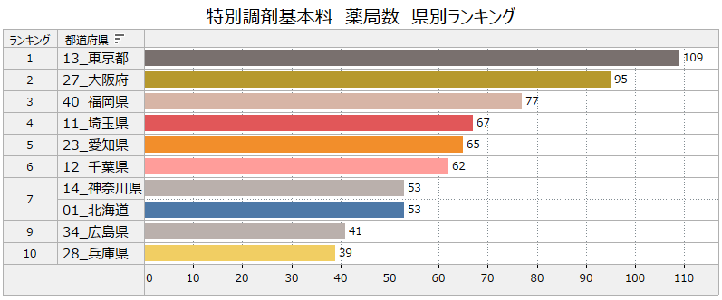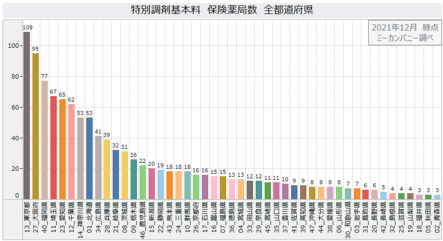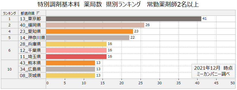 当社で調査したところ、これに該当する保険薬局は2021年12月時点で全国で1,111件。特別調剤基本料を算定する薬局には、必要な届出を行っていない薬局、漢方専門薬局なども含まれていますが、常勤薬剤師数2名以上で見た場合のランキングは次のとおり。