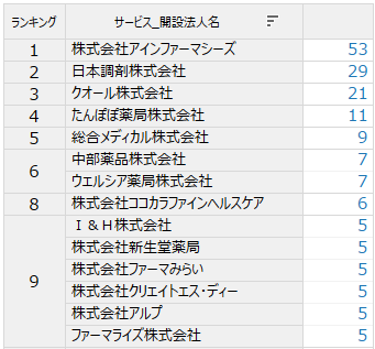 開設法人ごとに件数を確認したところ店舗数が多い順に表の通りでした。(店舗数上位10まで)