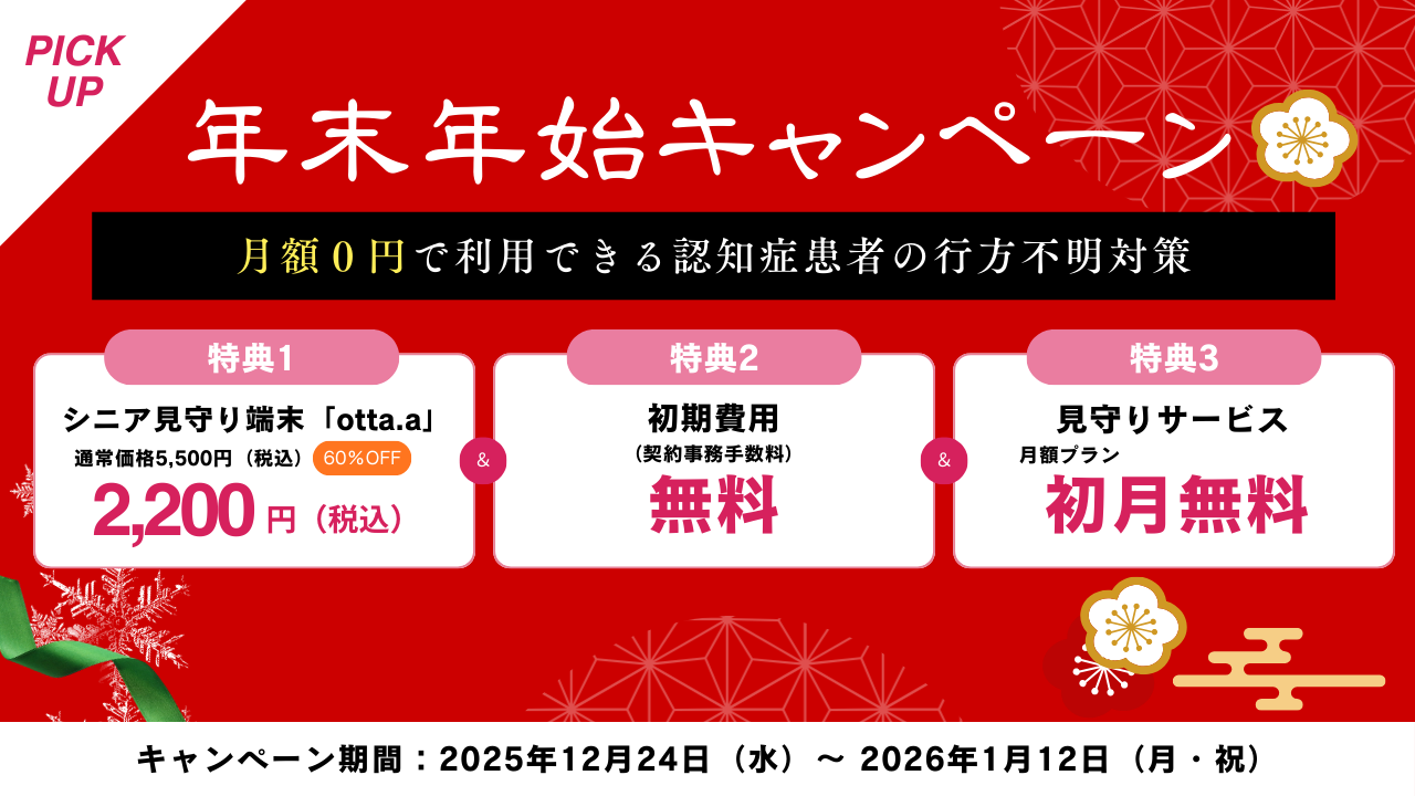IoTを活用したスマート見守りサービスを運営する株式会社otta(本社:福岡県福岡市、代表取締役社長:山本 文和)は、認知症による行方不明者を一人でも減らすことを目的に、「月額0円」から利用できる認知症患者の行方不明対策キャンペーンを2025年12月24日(水)より実施いたします。