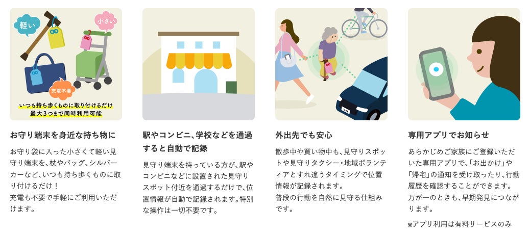 駅やコンビニなどの「見守りスポット」に加え、走行中の「見守りタクシー」やアプリを持つ「地域ボランティア(見守り人)」とすれ違う際にも位置情報を自動記録します。