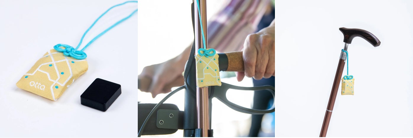 端末はお守り袋に入ったデザインで「ガジェット感」がなく、バッグや杖、シルバーカーなどに付けるだけで自然に馴染みます。