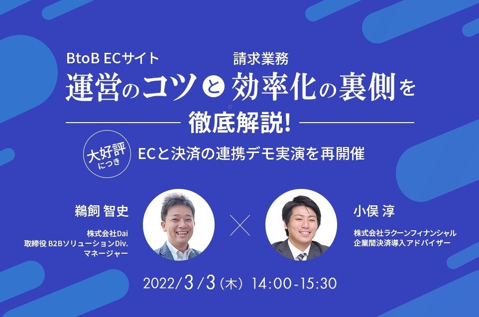 導入企業1000社超・買い手企業35万社突破、運営実績No.1(※)の「Bカート」を提供する株式会社Dai(京都市中京区)と、BtoB-ECを運営する中で生まれたBtoB決済サービス「Paid」を提供する株式会社ラクーンフィナンシャルが、オンラインセミナー「BtoB-ECサイト運営のコツと請求業務効率化の裏側を徹底解説!~大好評につきECと決済の連携デモ実演を再開催~」を2022年3月3日(木)に開催します。
