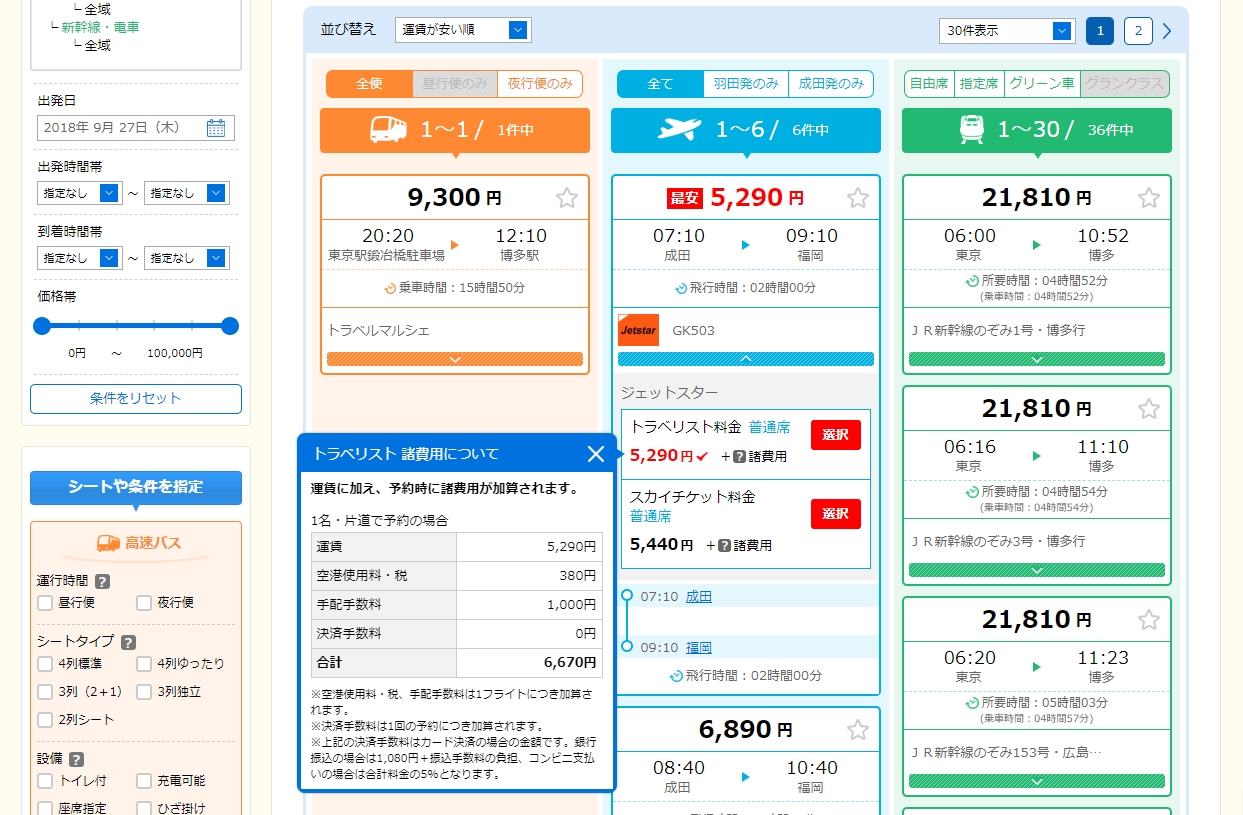 ▼高速バス・飛行機・新幹線 検索結果ページ 一例