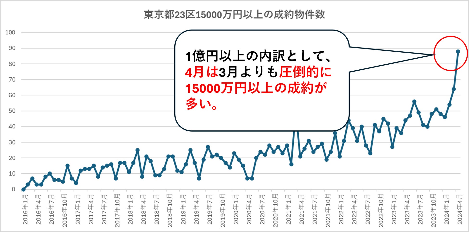 ここで直近の、東京都23区の1億円以上の中古マンションのみなし成約件数(グラフ3)を見ると、2024年で3月・4月では過去類を見ないほどの物件が成約しているようです。