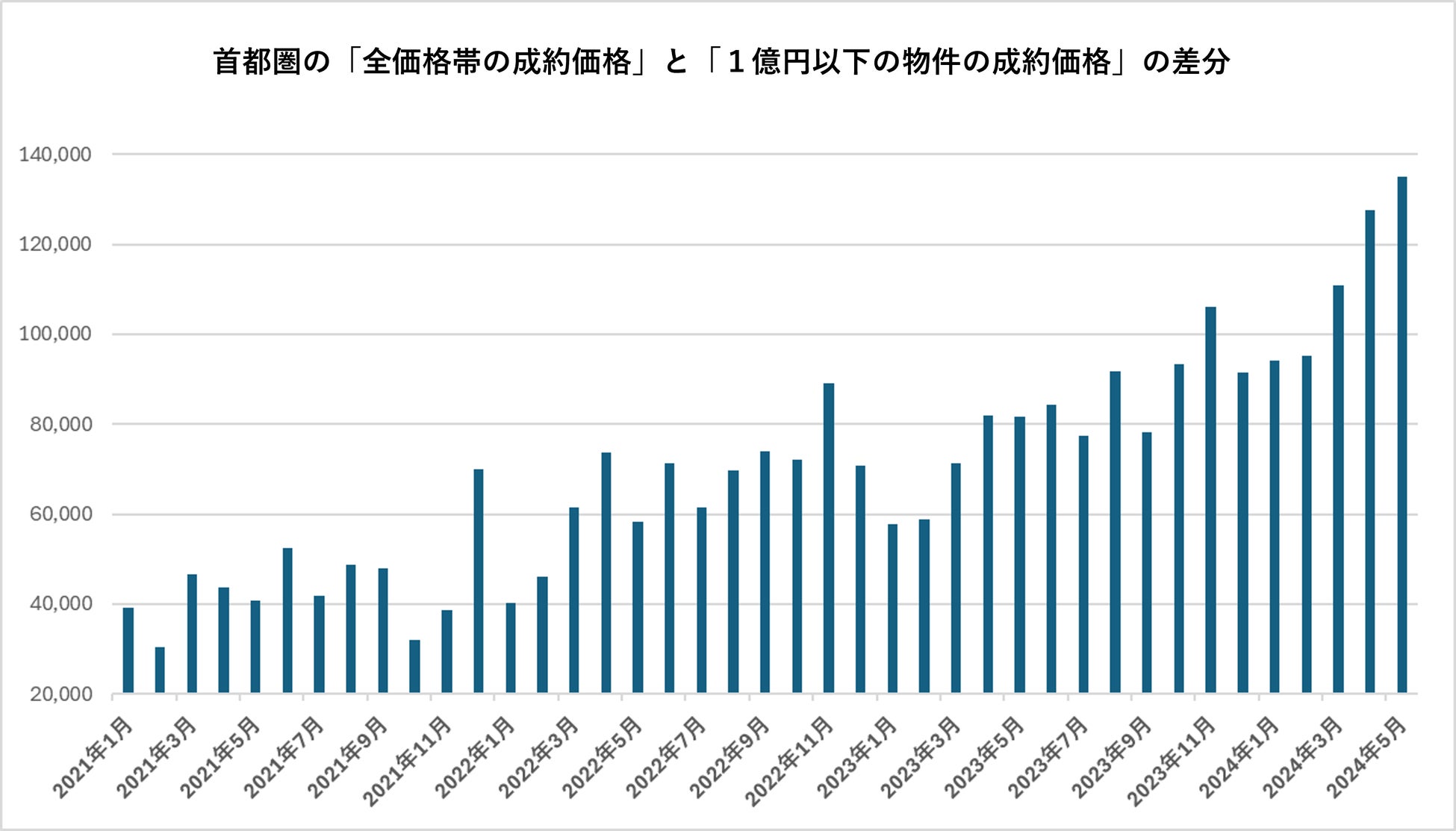 グラフ6:一都三県の「全価格帯の成約価格」と「1億円以下の物件の成約価格」の差分