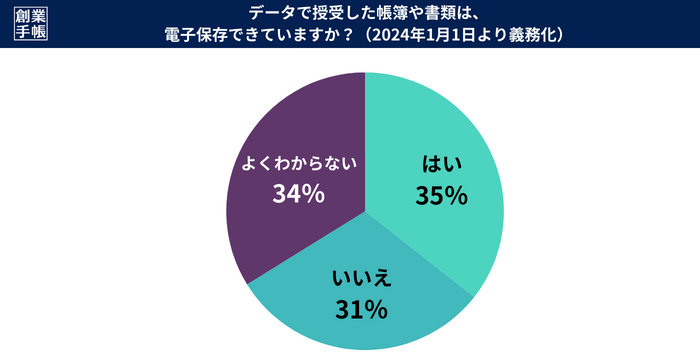 電子帳簿保存法の改正については段階を得て順次進めていくような形式が取られていますが、2024年1月に義務化された「電子取引における電子データ保存」の実施状況については、「保存できている」が35%「保存できていない」が31%、「よくわからない」が34%という結果になりました。