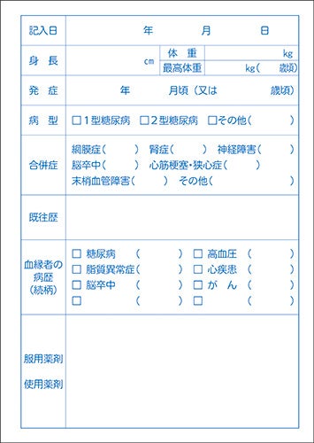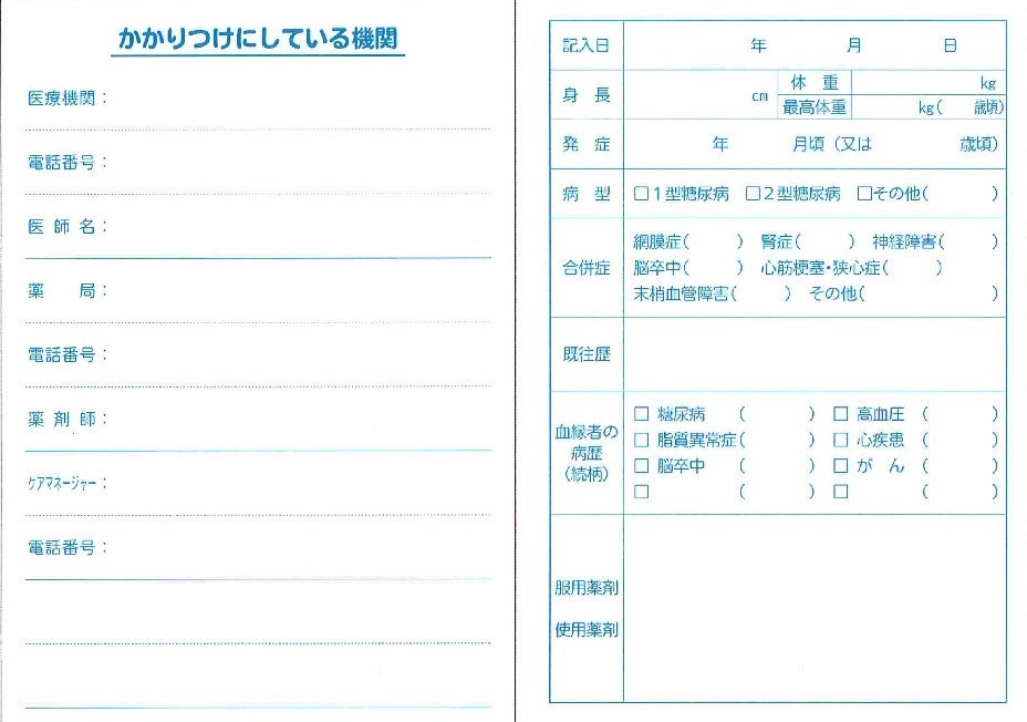 合併症・併存症では網膜症や歯周病など別の医療機関への受診が必要となるケースもあることから、かかりつけ医・眼科医・歯科医・薬剤師・ケアマネージャーはもちろん、急病で初めての病院に入院することになった時にも、その病院の医師が糖尿病の病状を把握するために糖尿病手帳は有用です。