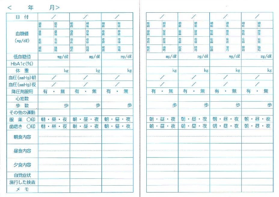 糖尿病手帳は、患者様ご自身が経過を確認したり、生活を顧みたりするのに活用します。