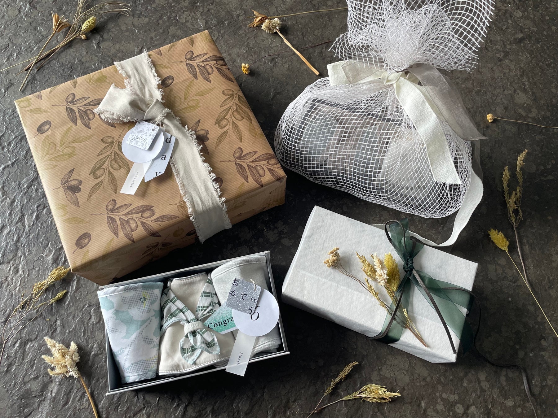 通常のギフトラッピングにプラスアルファできる、包装紙やリボン、ドライフラワーなどを用意しています。