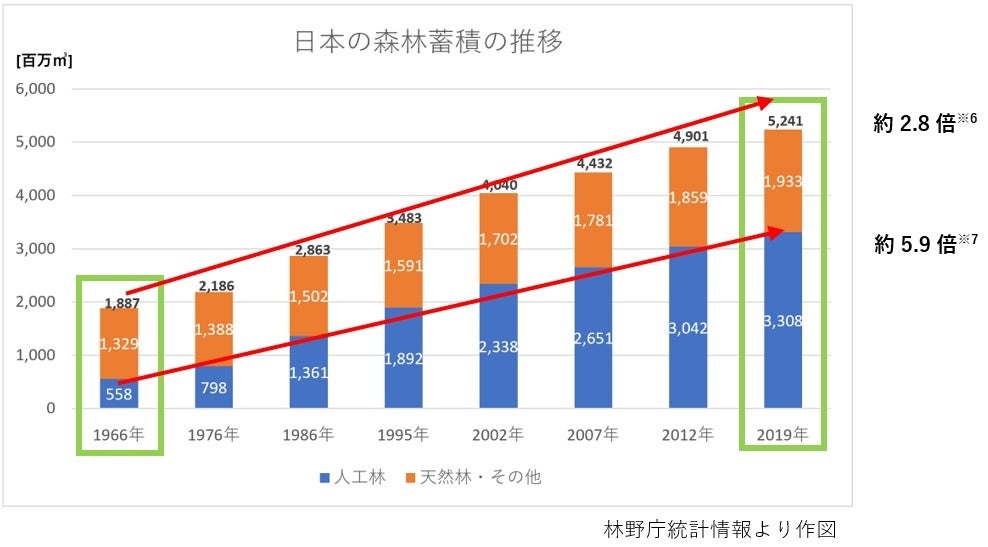 ※6※7 1966年と2019年における森林蓄積、及び人工林蓄積の対比