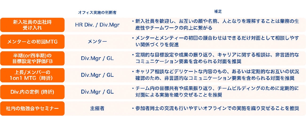 新オフィスにはマツリカ専用と各社共用エリアがあるため、業務や打ち合わせ内容に応じて使い分ける必要があります。新オフィスに移転後もオフィス/リモートワークは個々の社員の判断ですが、オフィス・対面での実施が有効と思われる業務を考慮し、最も効果・生産性が高いと思われる環境で業務を行います。