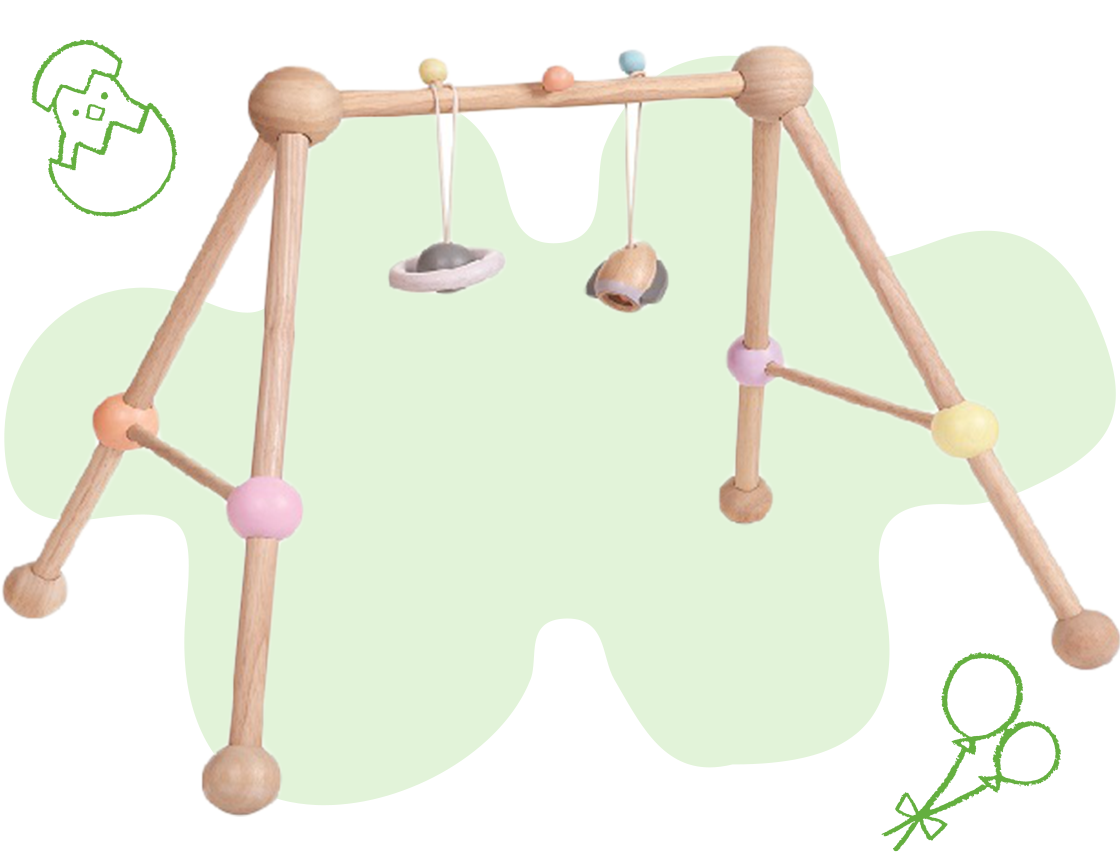 トイサブ!のおもちゃプランナーがセレクトした、ねんね期にあると嬉しいベビージム・おきあがりこぼし、リストラトルのセットです。