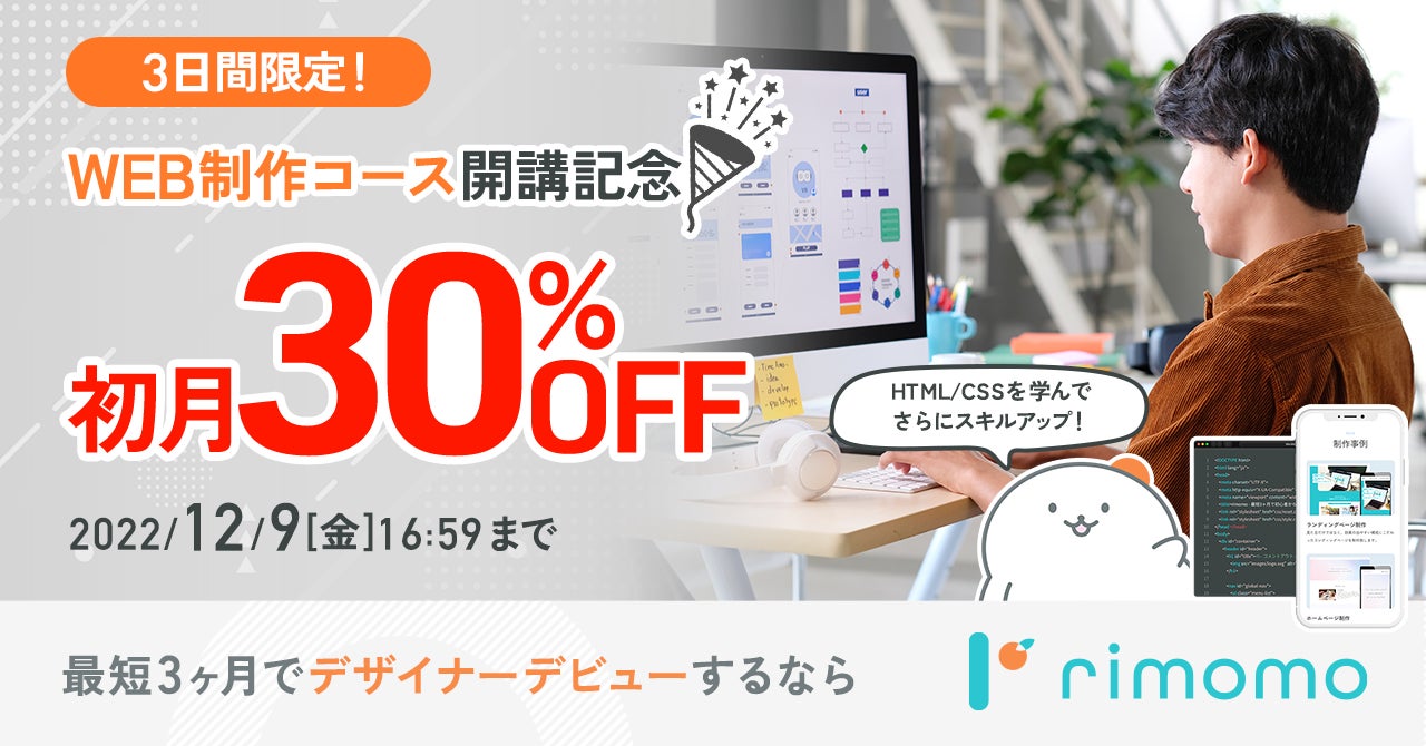株式会社パルミー(所在地:東京都港区、代表取締役:伊藤貴広、以下パルミー)は、本日2022年12月6日(火)よりデザインのスキルが学べるオンライン学習サービス「rimomo(リモモ)」のWEB制作コースを開講いたしました。また、同コースの開講を記念して2022年12月6日(火)17時00分〜12月9日(金)16時59分までの3日間限定で、受講料が初月30%OFFになるキャンペーンを開催いたします!