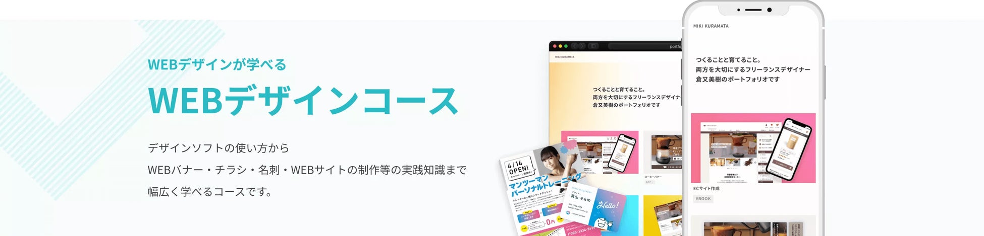 デザインソフトの使い方からWEBバナー・チラシ・名刺・WEBサイトの制作等の実践知識まで幅広く学べるコースです。