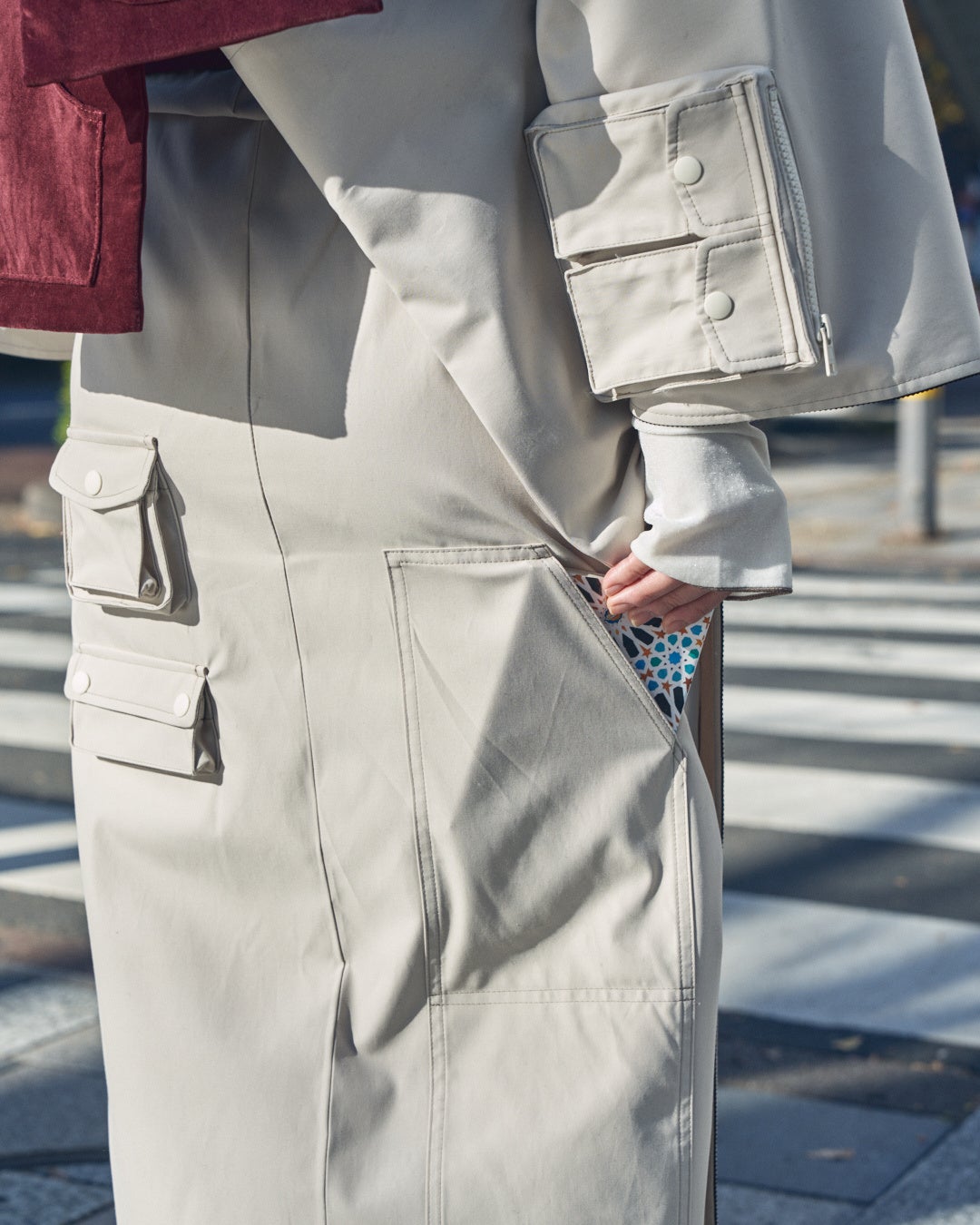 デザインのインスピレーションを受けたのは、機能面で沢山のポケットが付いているカメラマンジャケット。着物に落とし込む中で、アウトドア感が出過ぎないよう、着物が持つ上品さも残しました。生地は目の細かなトレンチコートの素材をセレクトし、パイピングを付けることでカジュアルになりすぎず、きちんと感を出しています。しわにもなりにくく、撥水効果もあり、お洗濯も可能です。スリーシーズンの長い間、気兼ねなくご着用いただけます。