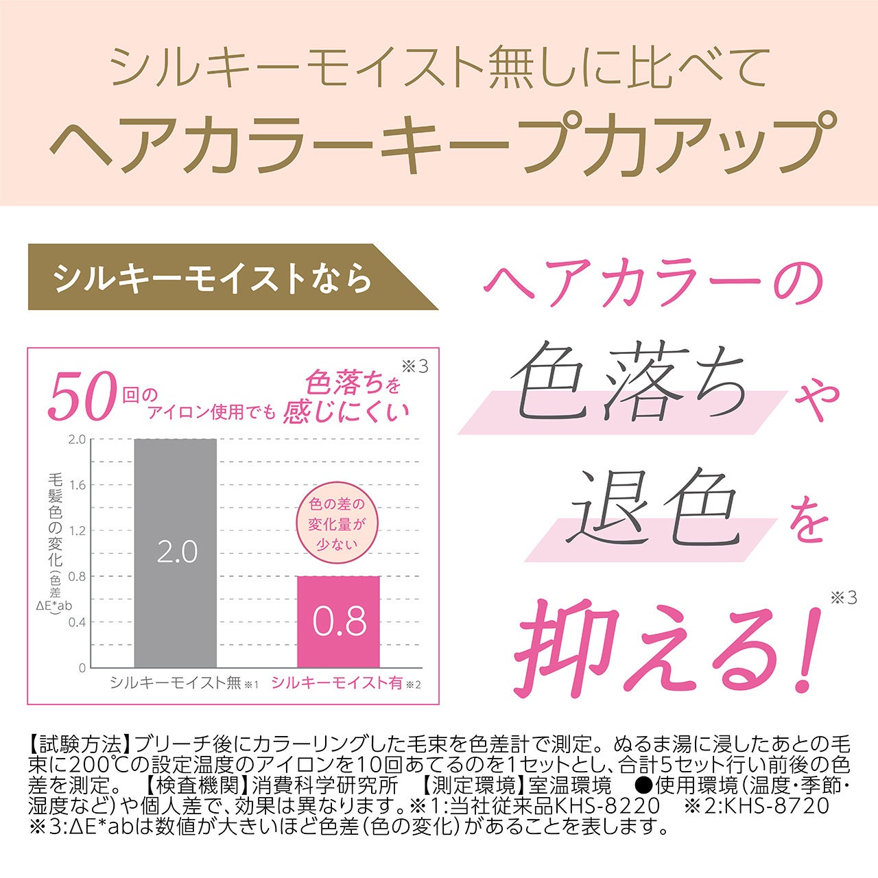・プレートに「シルキーモイスト加工」を施し、水分の蒸発を抑え、髪への熱ダメージとうるおいを守る。