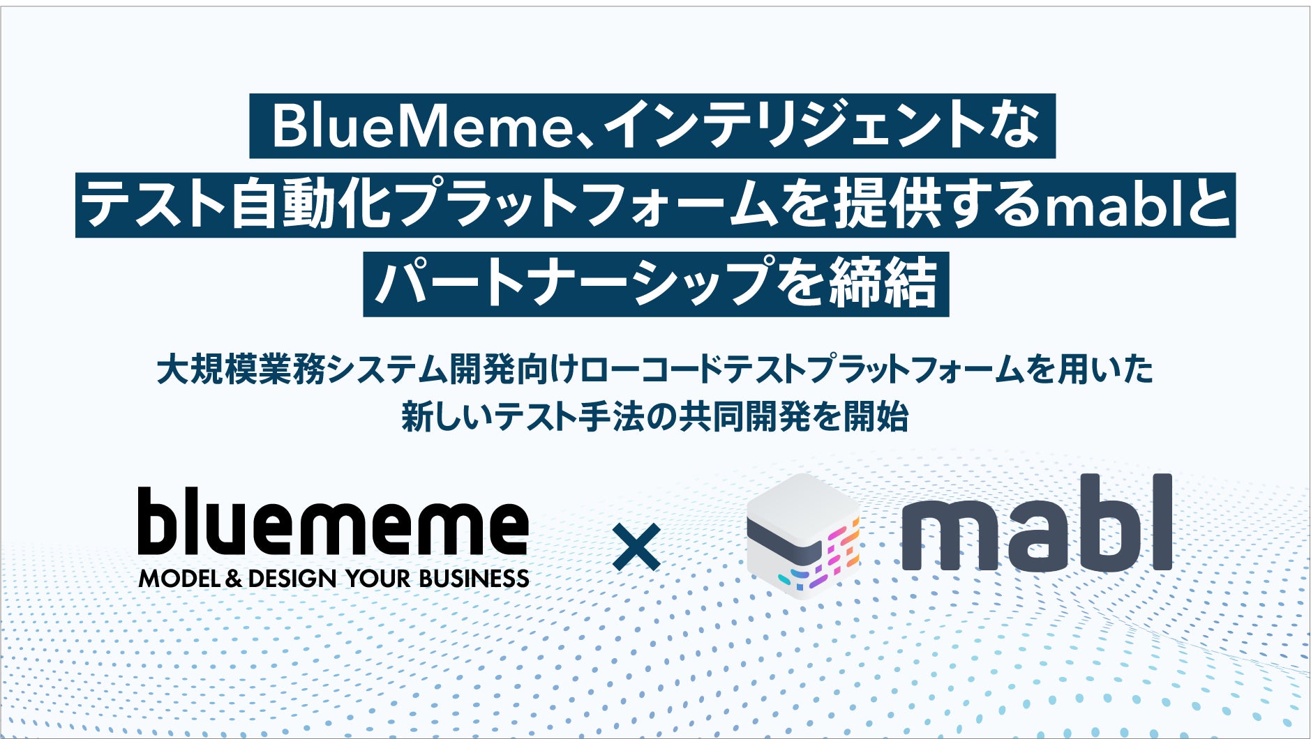 株式会社 BlueMeme(ブルーミーム、本社:東京都千代田区、代表取締役社長:松岡 真功、 以下 BlueMeme)は、システム開発のライフサイクル全体にわたって、信頼性の高いテストをローコードで実施可能なプラットフォーム(SaaS)「mabl(メイブル)」を提供する米国mabl Inc.(本社:マサチューセッツ州、Co-Founder:Dan Belcher、Izzy Azeri/以下、mabl)とパートナーシップを締結いたします。
