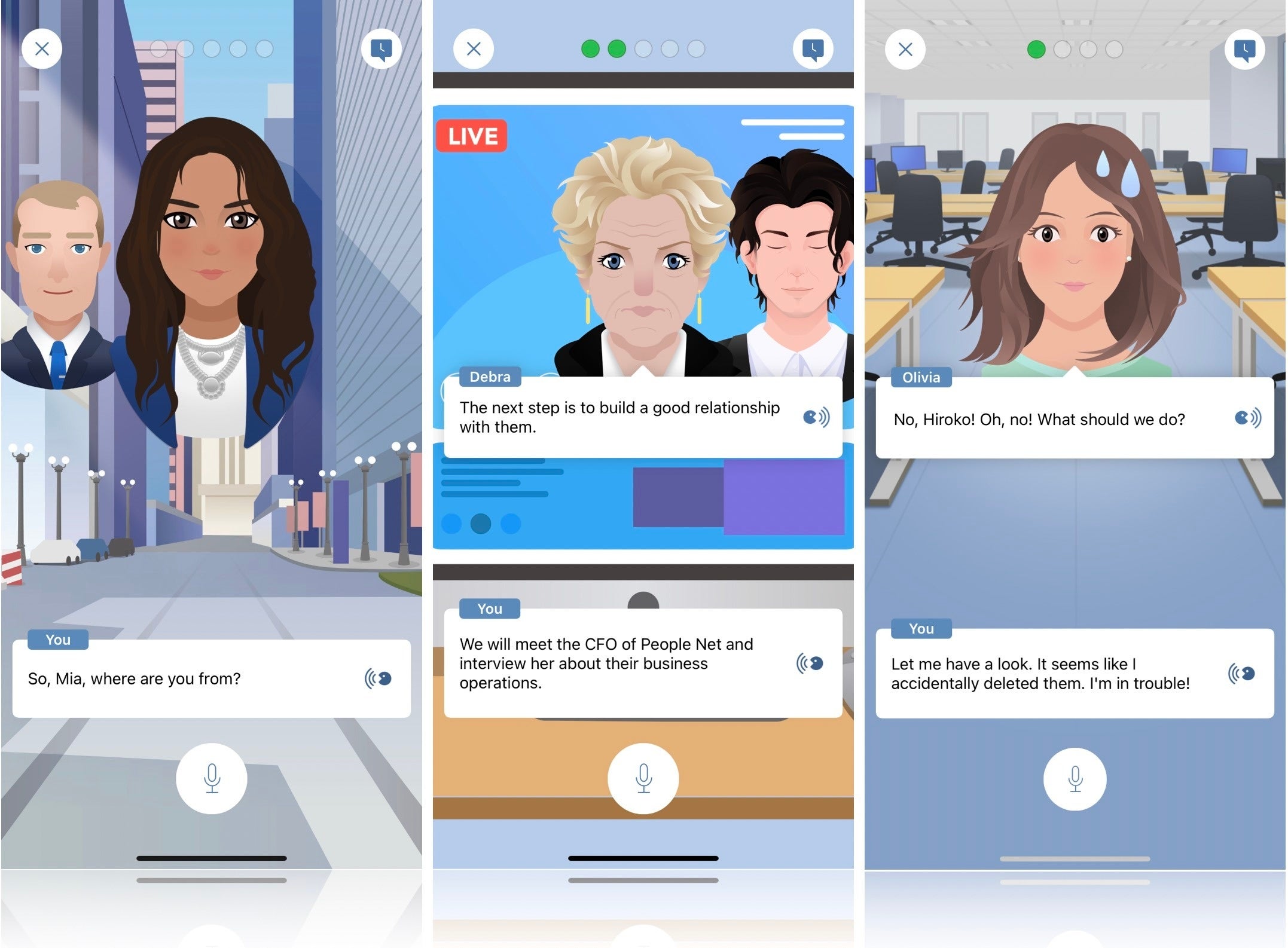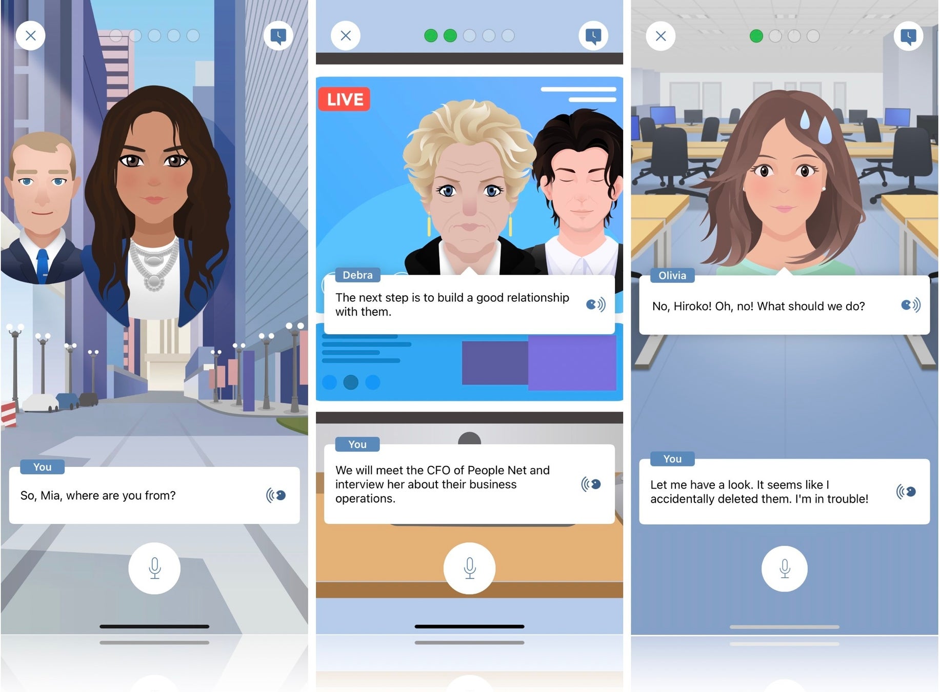 AIキャラクターとの会話において、近年社会に定着した「リモートワーク」「オンラインミーティング」「チャットによる社内コミュニケーション」を盛り込んだほか、ユーザーの没入感が高まることによる学習効果の向上を狙って、背景描写やキャラクターの表情・音響効果を充実させたり、より厳選されたキーフレーズへの見直しを行なっています。
