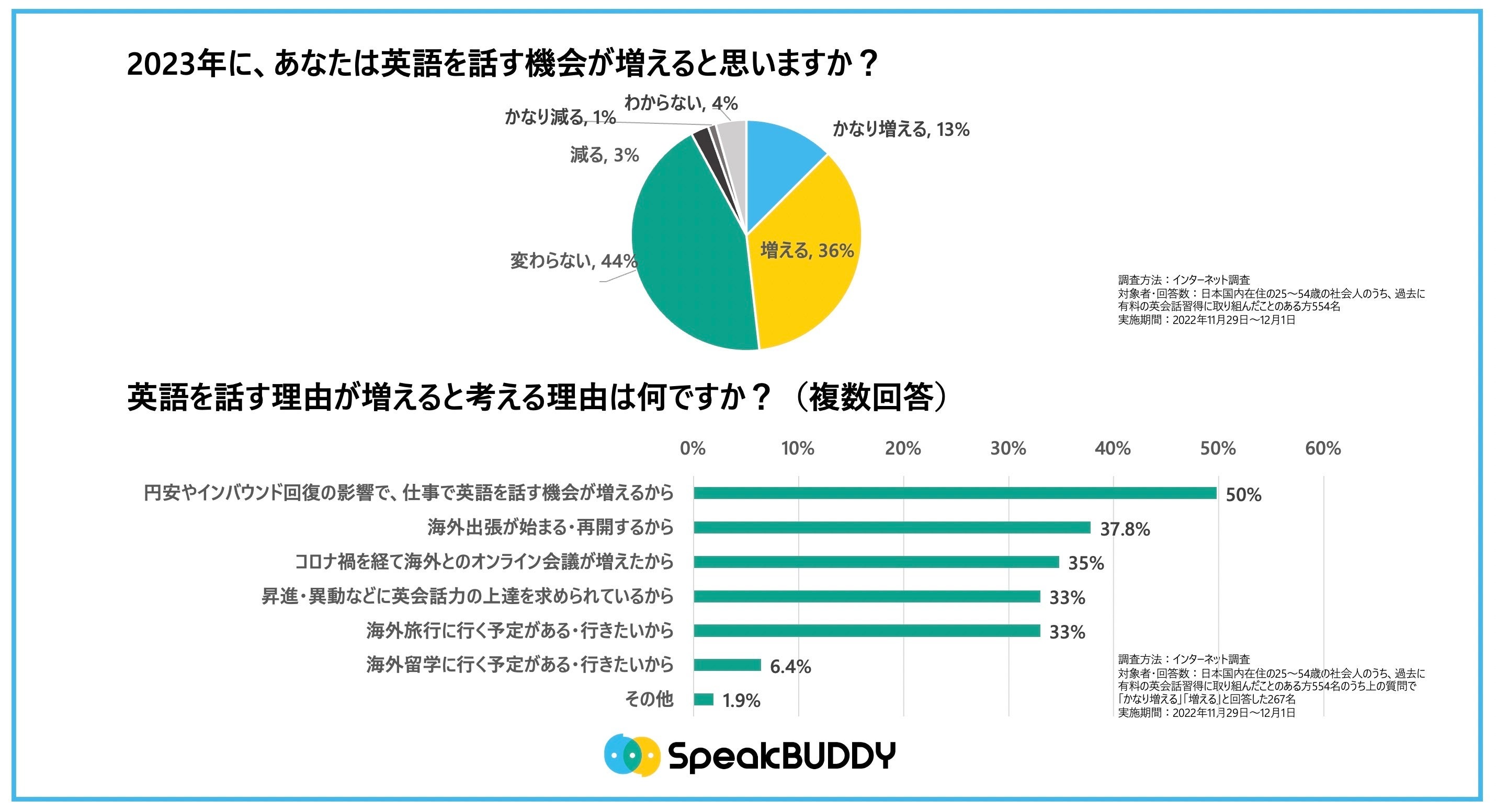 また、過去に有料の英会話学習に取り組んだことがある方においては、半数近くの49%が「2023年には英語を話す機会が増える」と回答。その理由として、「円安やインバウンドの影響で、仕事で英語を使う機会が増えるから」「海外出張が始まる・再開するから」「コロナ禍を経て海外とのオンライン会議が増えたから」を選択しました。