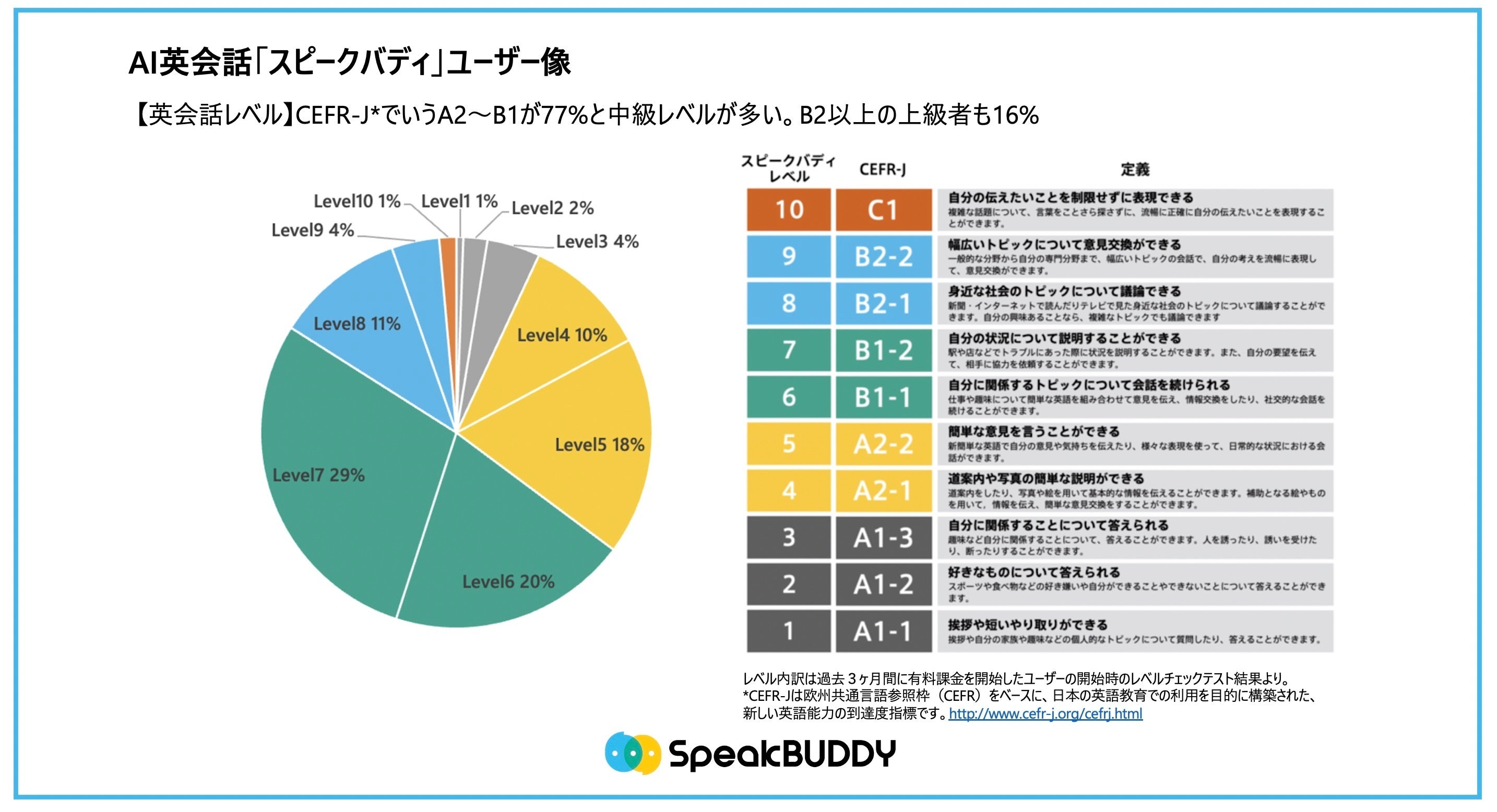 なお、上記のCEFR-Jを基にした10段階評価において、「スピークバディを3ヶ月間利用したユーザーは平均1.2ランクアップ」することが実績として確認できています。