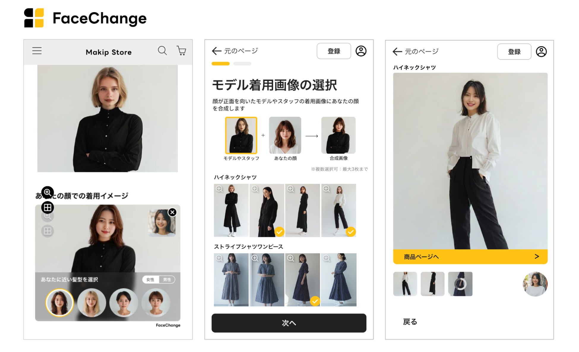 FaceChangeは、ECサイト上のモデルやスタッフの着用画像とユーザーの顔写真を合成し、自分の顔を合わせた着用イメージを可視化できるサービスです。(特許申請中)