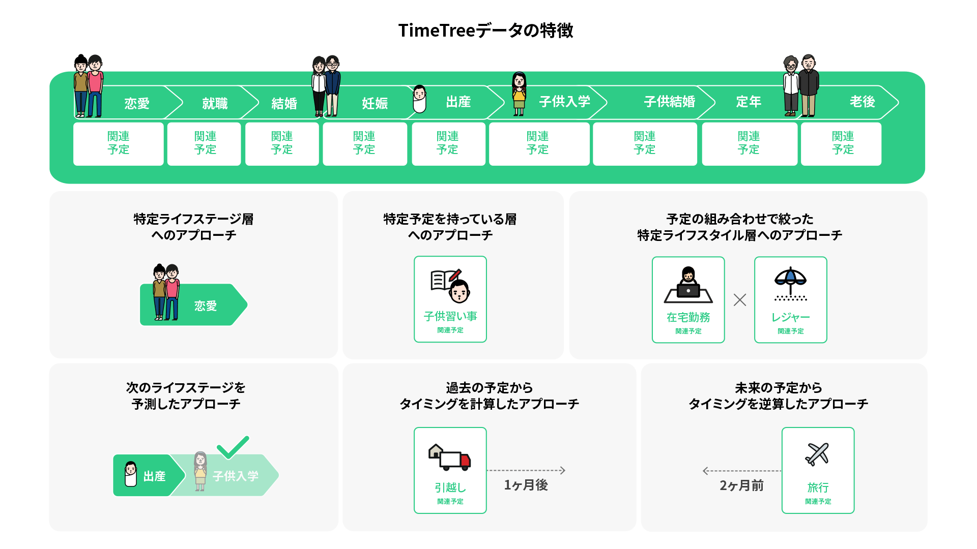 TimeTreeとDACが共同開発した広告配信システムです。ユーザーの行動や購買を予測するアルゴリズムを元に生成したセグメントでの配信により、精度の高いターゲティングを実現することが可能となっています。アルゴリズムでは、過去の実績データだけでなく、TimeTreeユーザーがカレンダーに登録している予定やライフイベントなどの「未来データ」を活用し、特定の日時や購入・サービス利用タイミングなど具体的なユーザーの未来の行動を予測します。