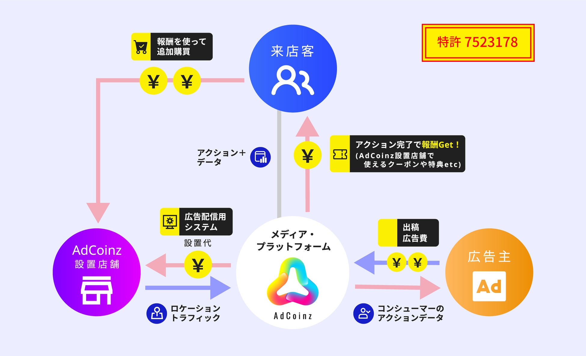 この度特許を取得した「AdCoinz®」は、従来のリテールメディアとは異なり、消費者へのリワード提供型広告を行う新しいリテールメディアです。QRコードのスキャン、アプリのダウンロードなどのアクションを通じてデータを提供した消費者には、クーポンなどその場で使えるリワードを提供。広告主にはリード獲得と広告効果の評価に関するデータを提供し、リテールには広告収益だけでなく、消費者によるリワードを活用した追加の購入を提供できる、三方よしの広告メディアです。「AdCoinz®」は、リテールに携わる各ステークホルダーにメリットのあるサービスを通して、これまでにない購買体験を提供し、「顧客体験価値」をさらに高めることができます。
