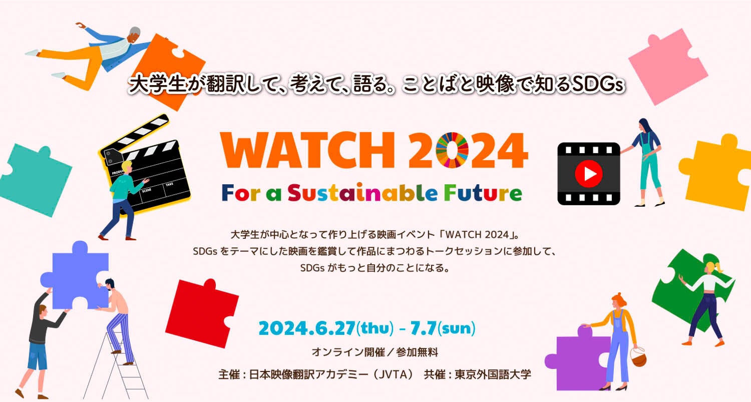 映像翻訳者を育成する日本映像翻訳アカデミー株式会社(本社:東京都中央区、代表取締役:新楽直樹、以下「JVTA」)は、「ことばの力で社会を豊かにする」という企業理念のもと、インターンシップ・プログラムをベースとした無料オンラインイベント「WATCH 2024 : For a Sustainable Future(以下、WATCH 2024)」を開催します。本イベントは東京外国語大学(所在地:東京都府中市、学長:林佳世子)が共催となる産学協働プロジェクトです。2022年のスタート以来3回目となる今回は、初の試みとして英語字幕を制作。SDGsをテーマにした日本制作のドキュメンタリー作品に学生が英語字幕をつけ、オンライン上映を行います。さらに上映作品に関連した発表や、トークセッションの開催も予定しています。