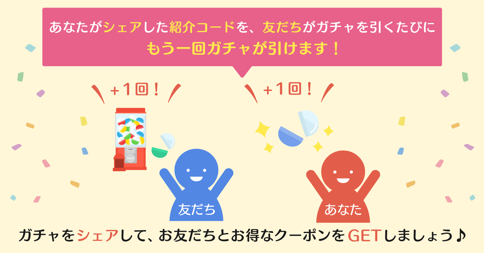 ※ ガチャ画面から発行される紹介コードをお友だちにシェアして、シェアした紹介コードをお友だちが使うごとに、あなたとお友だちそれぞれが追加でもう一度ガチャを引くことができます。