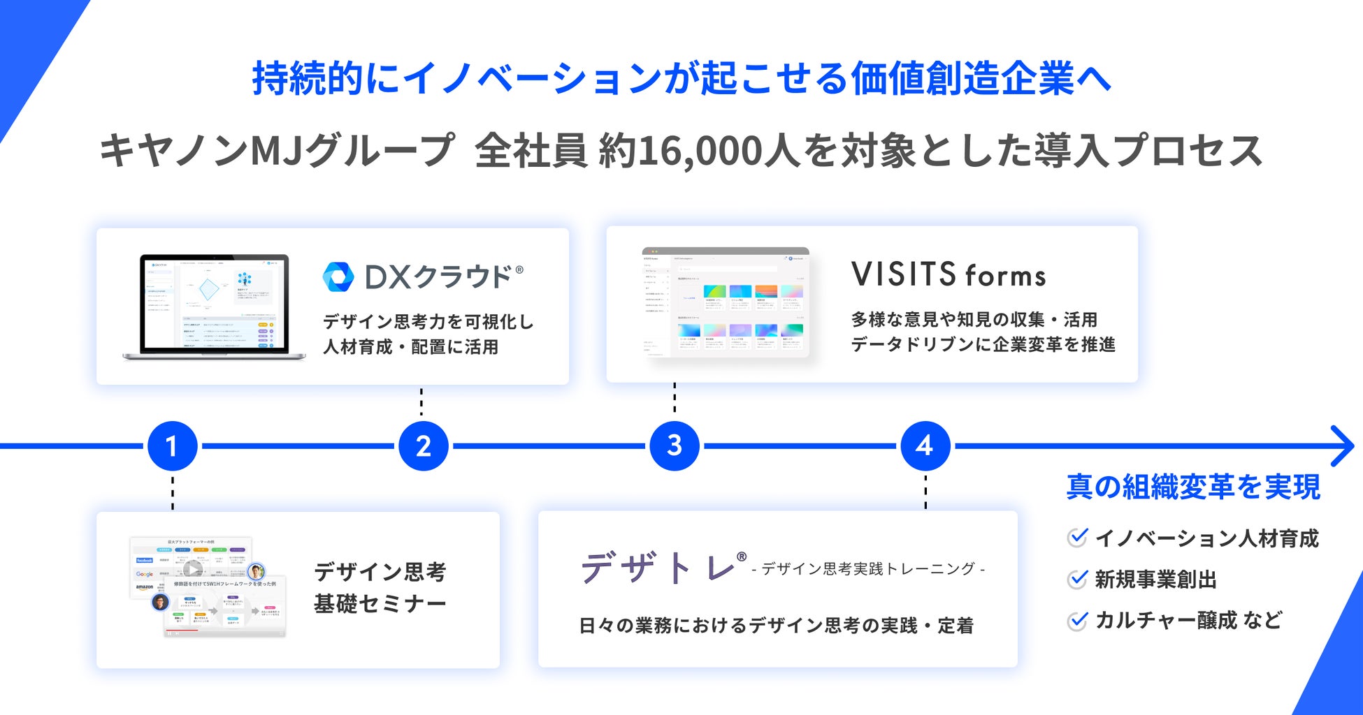 VISITS Technologies株式会社(代表:松本勝、以下VISITS)は、キヤノンマーケティングジャパン株式会社(代表:足立正親、以下キヤノンMJ)のグループ全社員約16,000人を対象に、デザイン思考テスト管理クラウド「DXクラウド®」を提供しました。VISITSが開発したデザイン思考テストは、AI時代に重要な「創造力」や「課題発見・解決力」が測定可能なオンラインアセスメントで、DXクラウド®はデザイン思考テストの運用・管理ができるツールです。