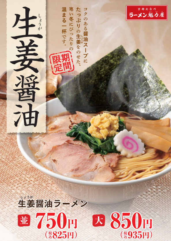 魁力屋フードコート店だけの限定販売!生姜×醤油が絶品の「生姜醤油ラーメン(しょうがしょうゆ)」が登場!