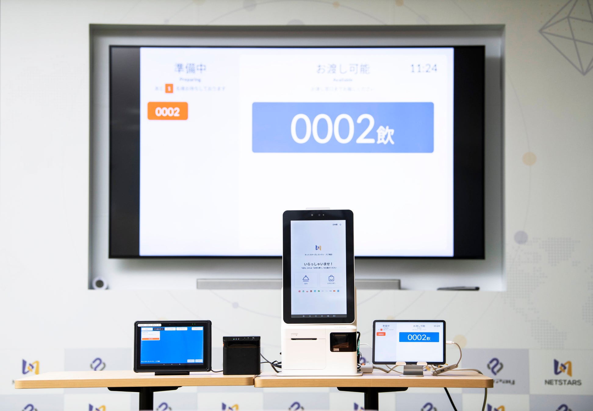 厨房やバックヤードで、注文内容を確認するタブレット(手前左)、注文内容を印刷するプリンター(手前左から二番目)、キオスク端末(手前左から三番目)、お客様向けに注文・調理状況を表示するタブレット(手前右)、店内呼び出し用大型プロジェクター(奥)