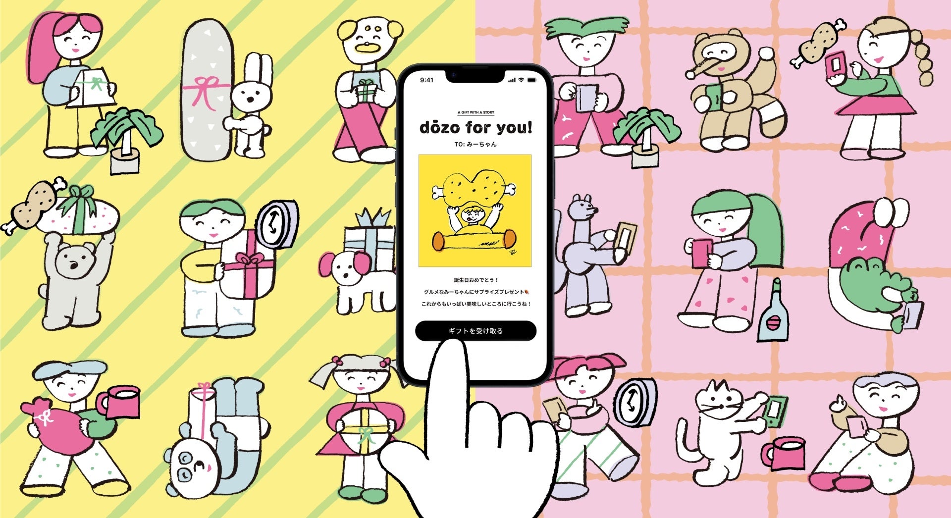dōzoのギフトを贈り合う、いろんな人たちを描いてみました。イラストのように“相手が喜んでくれるかな“と考えながら、dōzoのギフト選びを楽しんでもらえればうれしいなと思います。