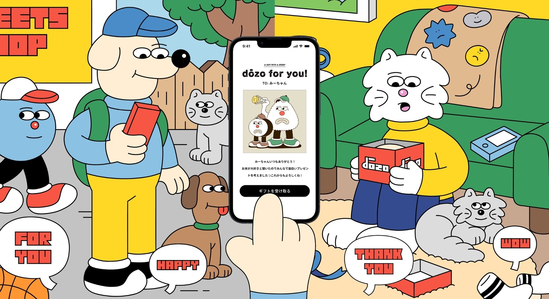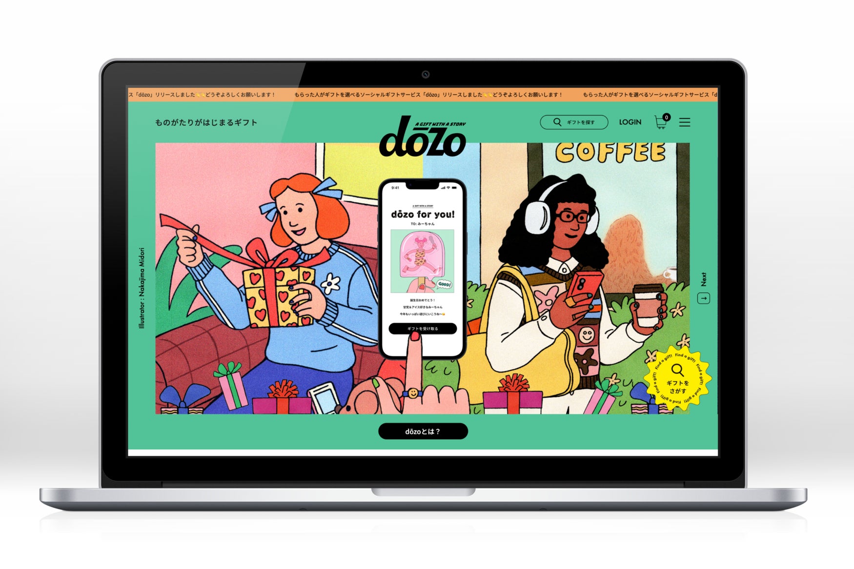 dōzoのサービスのたのしさが伝わるように意識しながら、たのしく描かせていただきました。私が大好きな動物である犬と猫を登場させて、プレゼントを送る側と受け取る側を対比させて描いてみました。HAPPYな気分が伝われば嬉しいです。