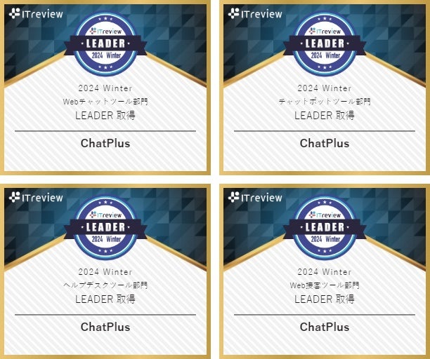 「ChatPlus(チャットプラス)」は、IT 製品のレビュープラットフォーム「ITreview 」において、ITreview Grid Award 2024 Winterの4部門で18期連続のLeaderに選出されました。