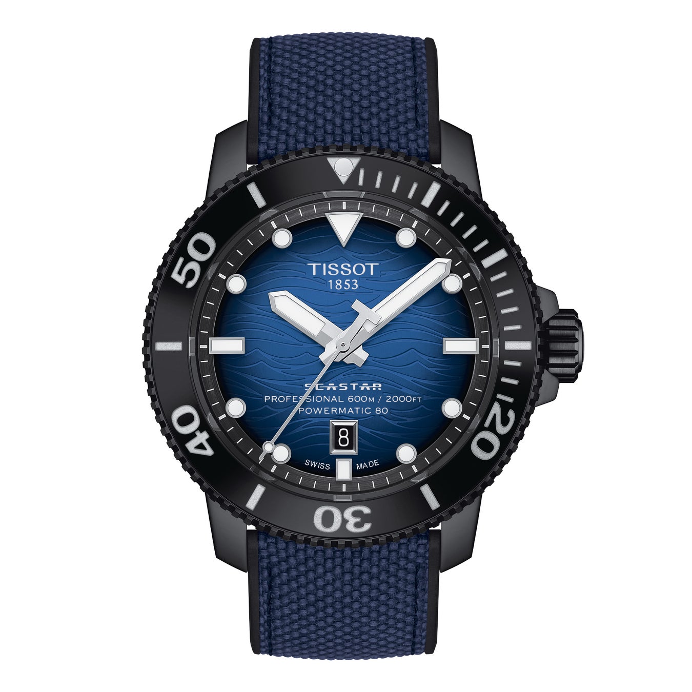 一方、ケース径46mmのティソ シースター 2000 プロフェッショナルは、高い性能と汎用性をもつオートマティックシリーズです。ケースはステンレススチール製とブラック PVD コーティングのステンレススチール製の2タイプ。タフなシルエットとブラックまたは海洋にインスパイアされたブルーのグラデーションが施された波模様のダイアルが特徴です。耐磁性に優れたムーブメント、パワーマティック 80と60気圧(600m/2000ft)の防水性能、セラミック製逆回転防止ベゼル、ねじ込み式リューズ、時分針へのスーパールミノヴァ®加工、ヘリウムエスケープバルブを備えており、ISO 6425(2018)ダイバーズウォッチ認証を受けています。