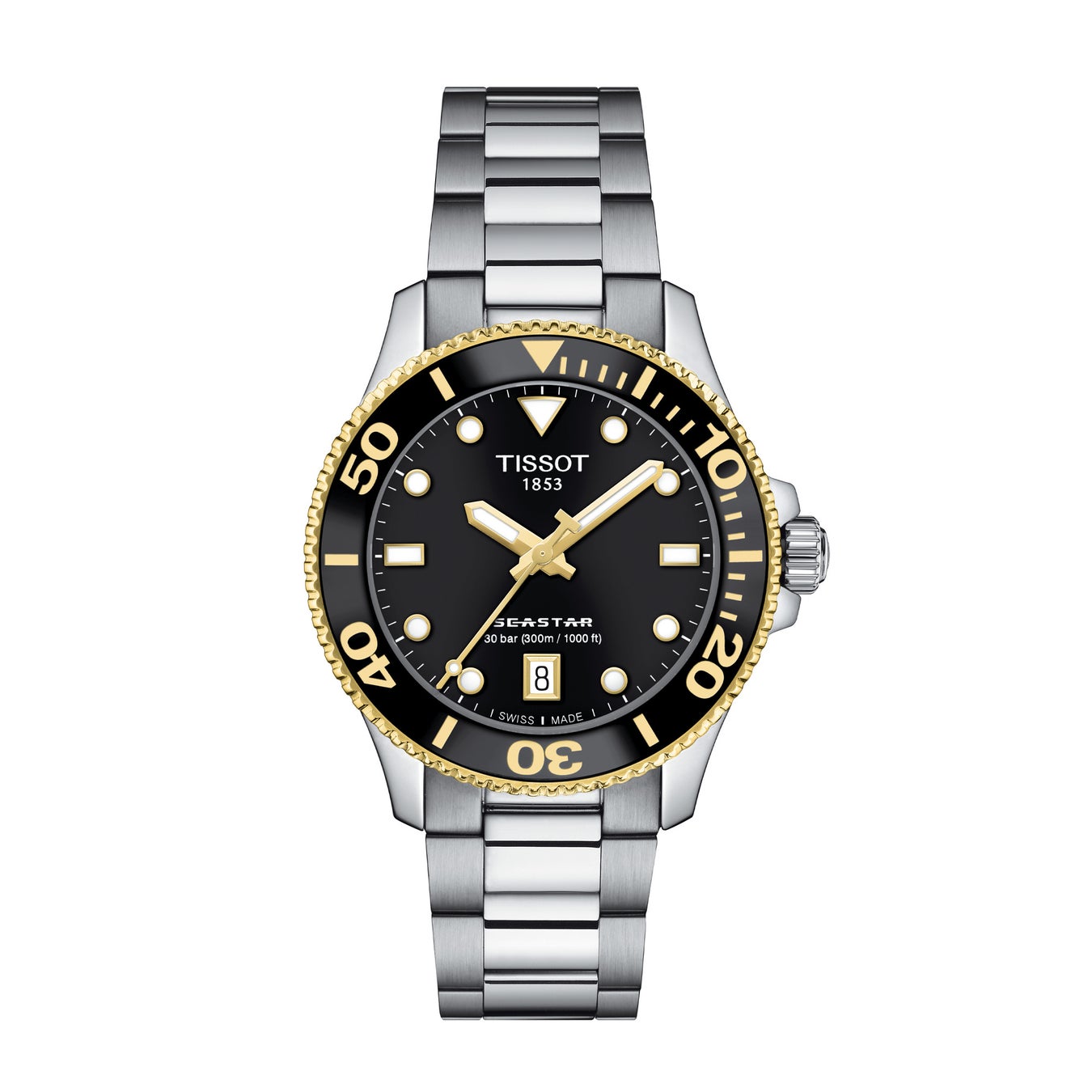 ケース径36mmのティソ シースター 1000 クォーツは、ブラック、ブルー、ホワイトのラッカー仕上げのダイアルにイエローゴールドやシルバーのアクセントを追加。力強いステンレススチールブレスレットで仕上げています。ストラップはインターチェンジャブルシステムを採用しているため、オーナー自身で交換が可能。30気圧(300m/1000ft)の防水性能と逆回転防止ベゼルも備えています。