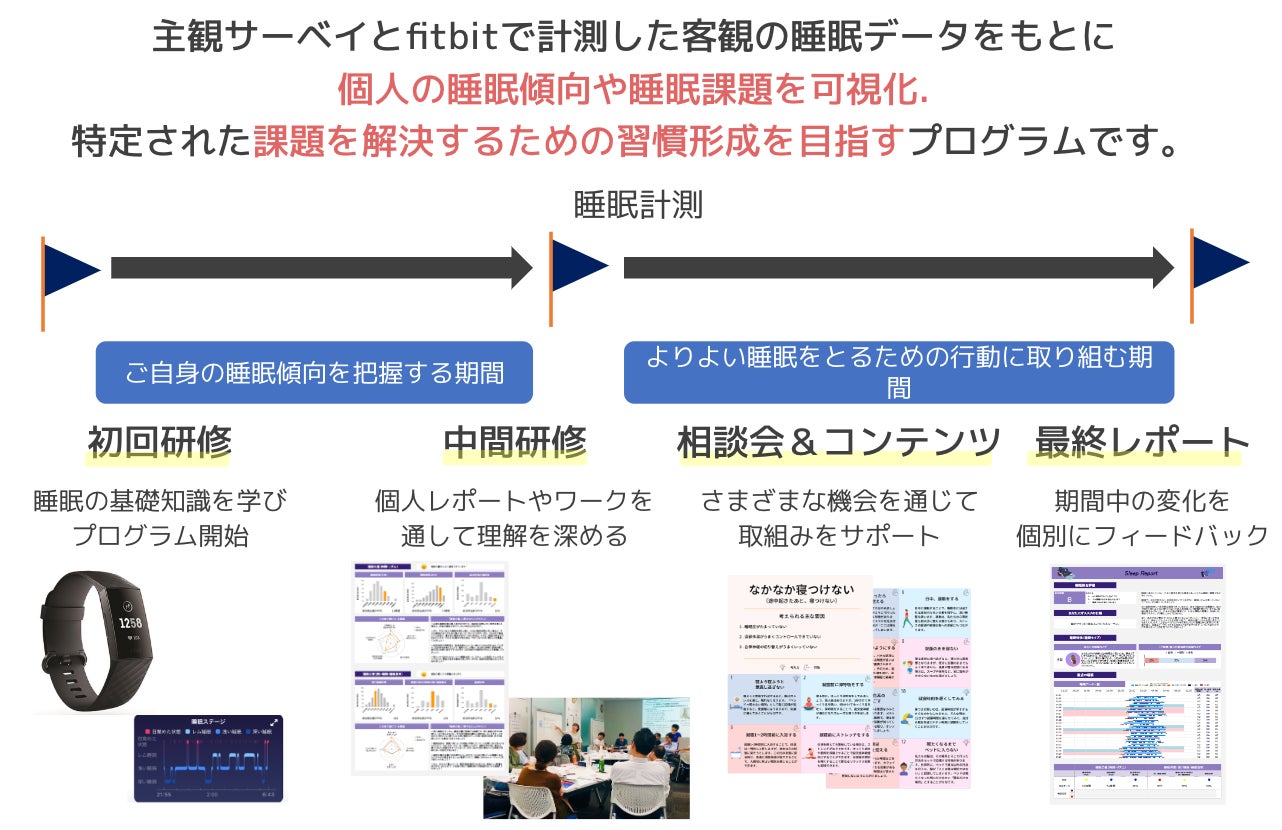 睡眠計測デバイスFitbitを活用し認知行動療法の要素を取り入れた睡眠習慣改善プログラムです。前半は計測のみを行い個人の睡眠傾向や課題を分析、中間研修のタイミングで個人へ睡眠レポートを提供して解決したい睡眠課題を合意形成、後半はその課題解決に効果的な行動習慣を生活の中に定着させる介入度が高いプログラムです。