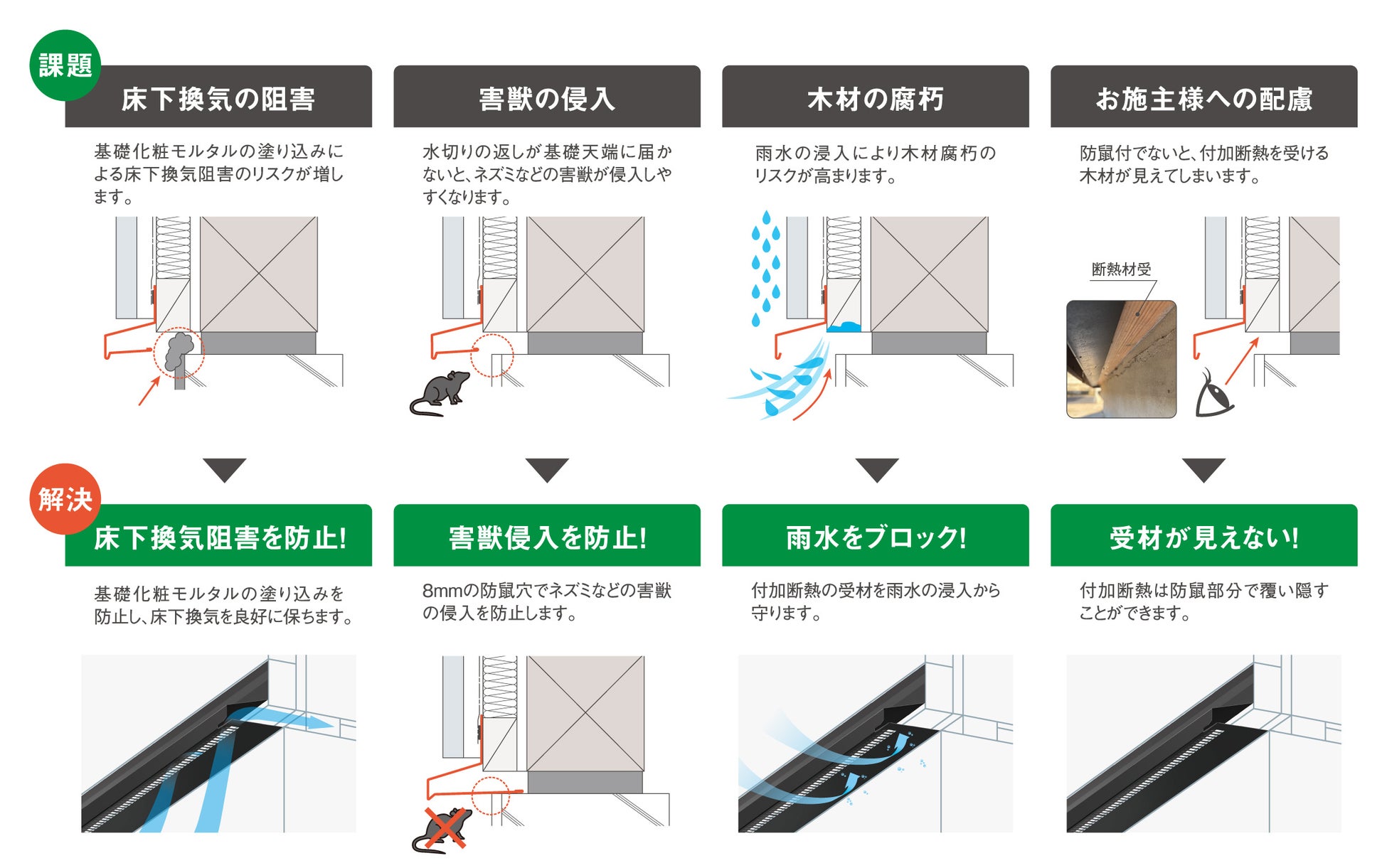 防鼠付水切りが持つ本来の機能を発揮させるために適切なサイズや形状を選ぶことで、返しが基礎天端まで届いていない事による課題を解決します。