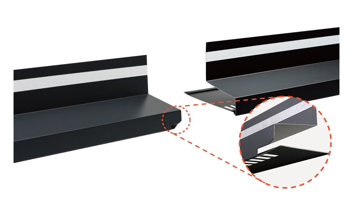 正面の見付幅18mmでスリムな納まりを実現。水切り本体の端部に切り欠き加工が施され、ジョイントカバー不要で手軽に本体同士の接続が可能です。