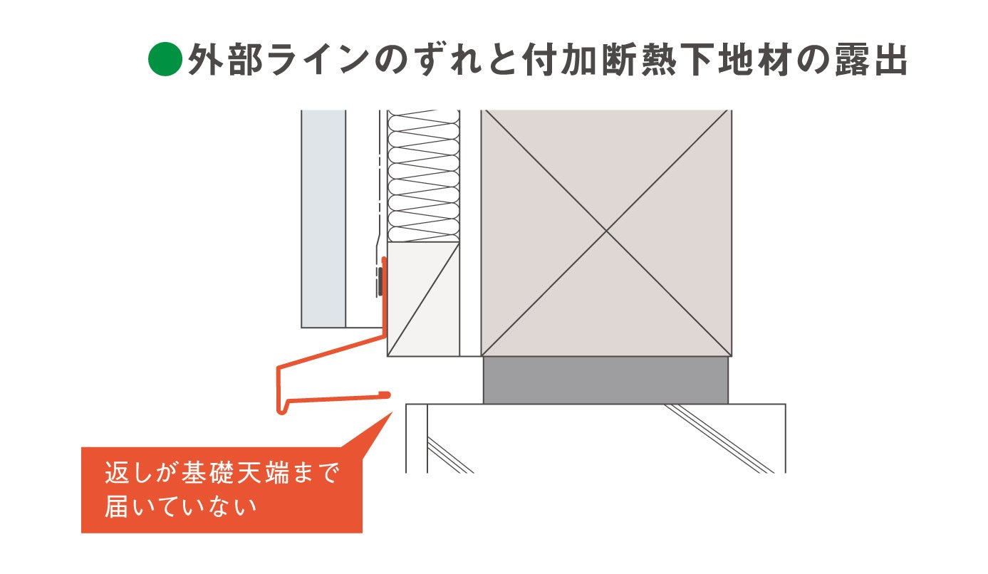 特に床断熱や基礎内断熱の場合、付加断熱にすると基礎の外部ラインと壁の外部ラインにズレが生じます。このときZ型の土台水切りや立ち上がりと同面までしか返しがない水切りを使用していると、付加断熱の下地材が露出します。下地材が露出したままの納まりだと、返しが基礎天端まで届いていない事でさまざまな課題に繋がるため、適切な部材選択と正しい施工での対策が必要です。