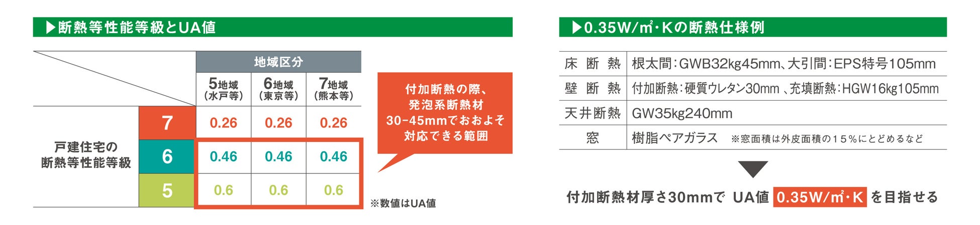 例えば、日本の4割強を占める断熱地域区分5~7地域では、壁の付加断熱に厚さ30~45mmの発泡系断熱材を使用することで、等級6程度のUA値まで向上させることができます(0.35W/㎡・K程度※)。発泡系断熱材で付加断熱をすると壁厚も抑えられるため、狭小住宅でも高性能かつ居住空間にも優れた住宅にすることが可能です。