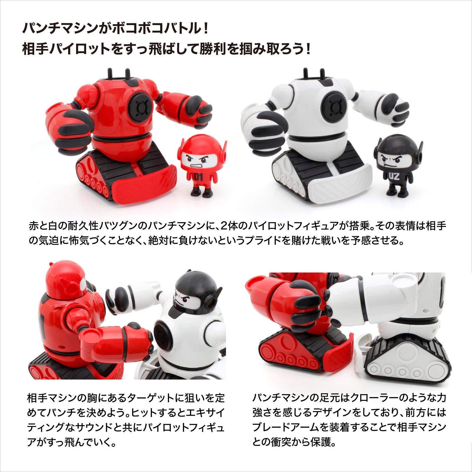 パンチマシンがボコボコバトル!相手パイロットをすっ飛ばして勝利を掴み取ろう! 赤と白の2体のパイロットが、耐久性バツグンのパンチマシンに搭乗してボコボコバトル!両こぶしから繰り出すフックと必殺ラッシュを使いこなし、相手マシンの胸にあるターゲットにパンチを決めよう。